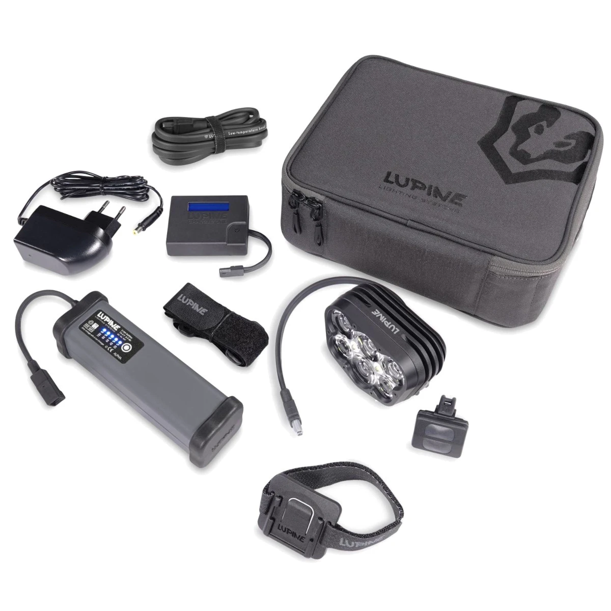 Cabezal de lámpara Alpha, mando a distancia Bluetooth, soporte para el mando a distancia, batería SmartCore de 6,9 Ah, soporte para casco FrontClick, extensión de 120 cm, correa de gancho y bucle, cargador y bolsa