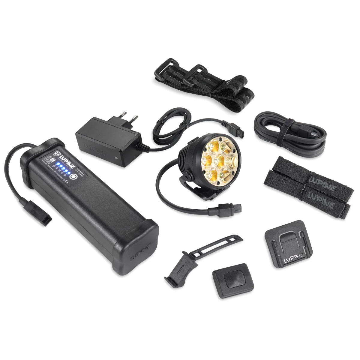 Cabeza de lámpara Betty, mando a distancia Bluetooth, soporte para el mando a distancia, batería SmartCore de 13,8 Ah, soporte para casco FrontClick, extensión de 120 cm, correa de velcro, cargador y bolsa.