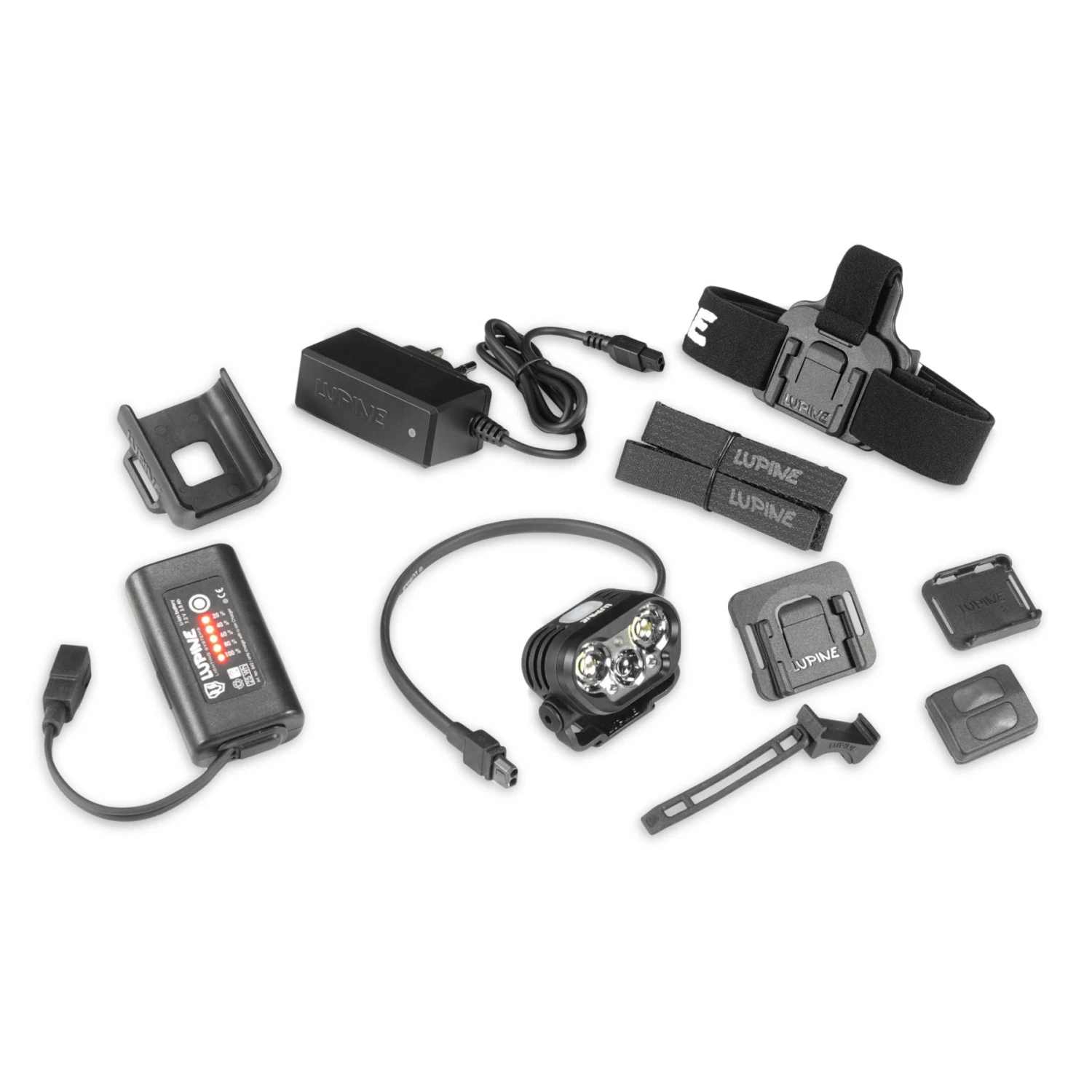 Volumen de suministro: cabeza de la lámpara con soporte de casco FrontClick, cinta de cabeza con soporte FastClick y FrontClick, mando a distancia con soporte de manillar y soporte de pulsera, batería SmartCore con soporte de casco FastClick, cargador Wiesel