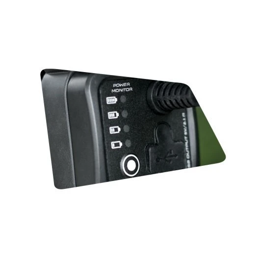 - Las células de Panasonic incorporadas en la batería proporcionan una salida de 6400 mAh. El estado actual de carga de la batería puede leerse directamente a través del indicador de cuatro niveles. Un puerto USB también permite la carga de otros dispositivos como el sistema de navegación o el smartphone.