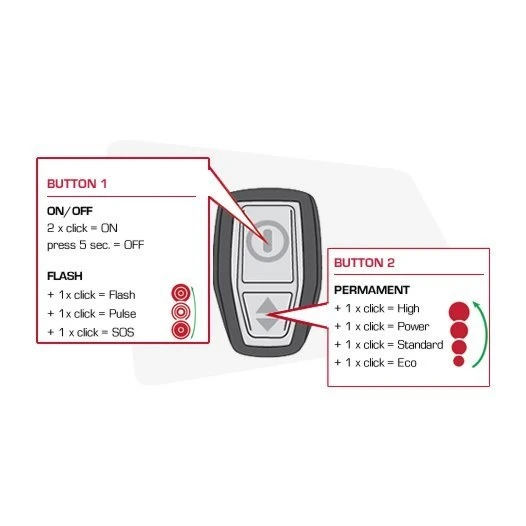 - Haga doble clic en el botón superior para encender el BUSTER 2000 HL. Al mantener la llave presionada por más tiempo, la luz del casco se apaga de nuevo. Use la tecla superior para cambiar entre los tres modos de parpadeo. La tecla inferior cambia a través de los cuatro modos de luz continua.