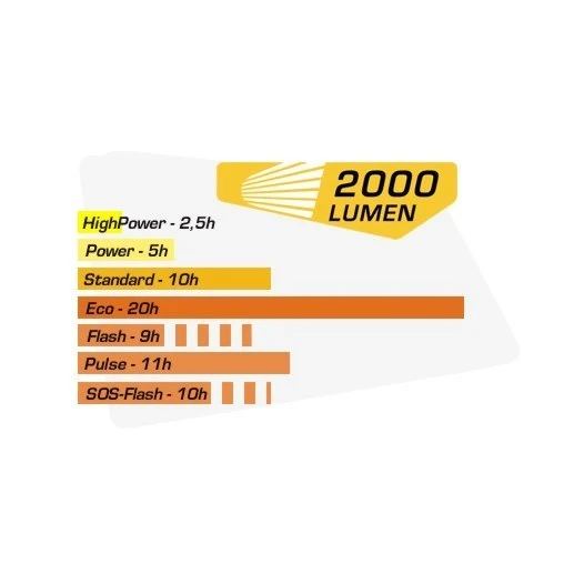 - Con siete modos diferentes, la intensidad de la luz puede ser regulada de manera ideal. Los cuatro modos de iluminación continua «Eco» (300 lúmenes), «Estándar» (600 lúmenes), «Potencia» (1300 lúmenes) y «Alta Potencia» (2000 lúmenes) permiten dividir el tiempo de combustión. Los tres modos de parpadeo «Flash», «Pulso» y «SOS» sirven para prestar más atención.