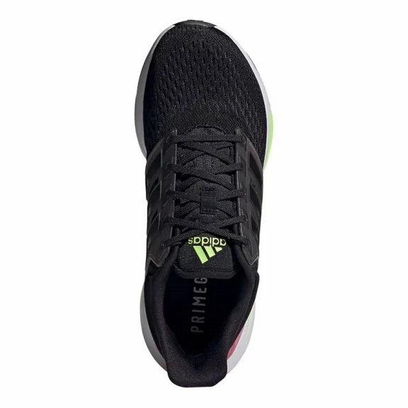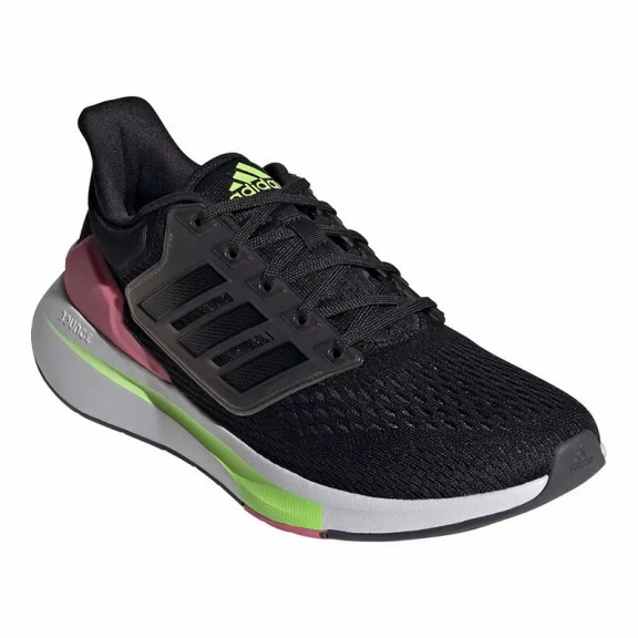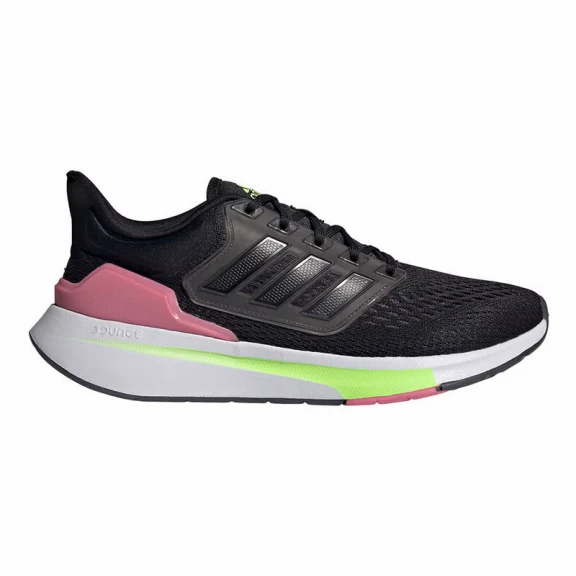 Zapatillas adidas EQ21 Run en negro gris rosa de mujer, parte superior transpirable mantiene los pies frescos en las carreras de larga distancia.